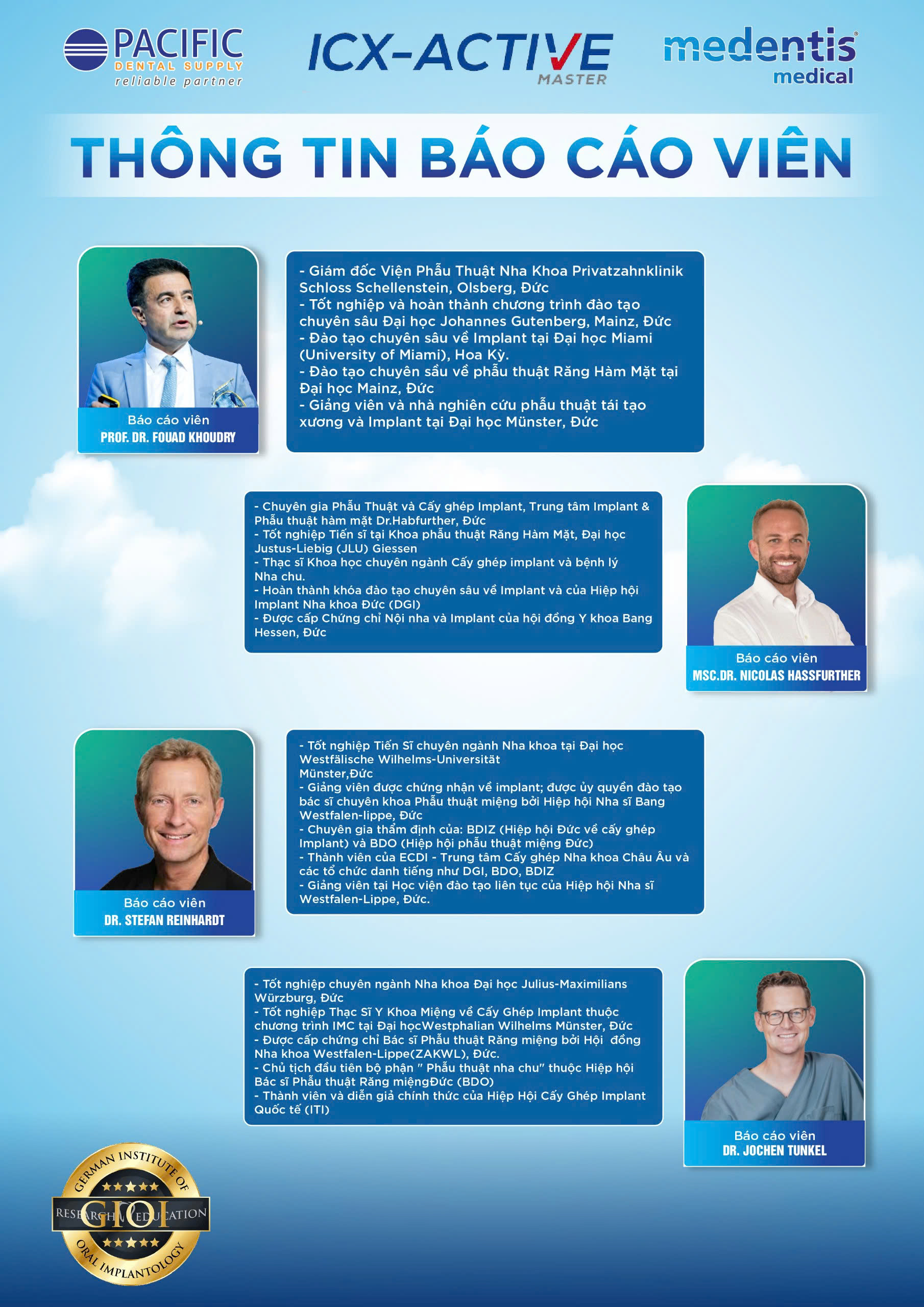 • Và đặc biệt, cơ hội gặp gỡ và học hỏi từ Dr. Stefan Reinhardt, chuyên gia người Đức có kinh nghiệm hơn 10000 ca cấy ghép implant với hơn 33 năm kinh nghiệm, sẽ chia sẻ về chủ đề "Tăng thể tích xương trong khi bảo tồn màng xương – Kĩ thuật từng bước. Kết quả và biến chứng."