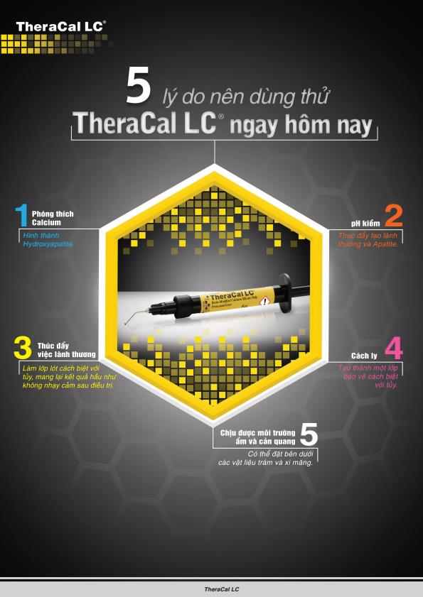 TheraCal LC là vật liệu trám lót Calcium Silicate gia cố nhựa, quang trùng hợp, được thiết kế để sử dụng trong che tủy trực tiếp và gián tiếp, như là lớp trámlót/ lớp nền bảo vệ bên dưới vật liệu Composite, Amalgam, Cement và các vật liệu nền khác. Nó có thể được sử dụng như là một sự thay thế cho Canxi Hydroxit, Glass Ionomer, RMGI, IRM/ ZOE và các vật liệu trám khác.
